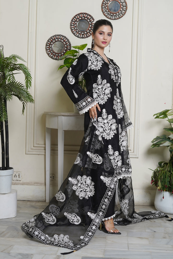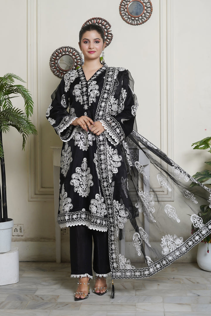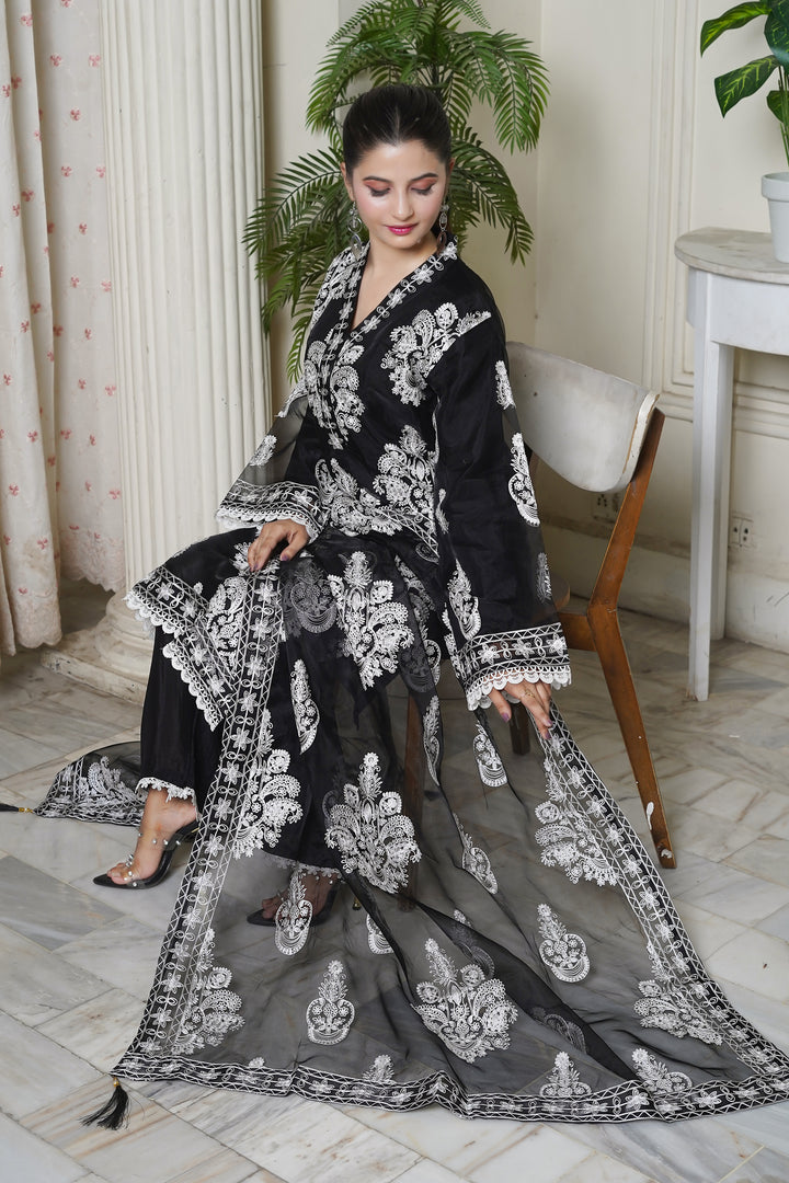 This exquisite Daily/Basic Wear Organza Kurta Set is a timeless addition to your wardrobe. The black color and embroidered details add a touch of sophistication. The set includes a Short Kurta top, Straight Trouser bottom, and matching Organza Dupatta. Perfect for all seasons, this 3-piece set exudes elegance effortlessly.