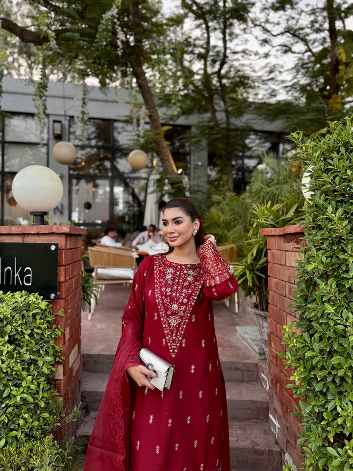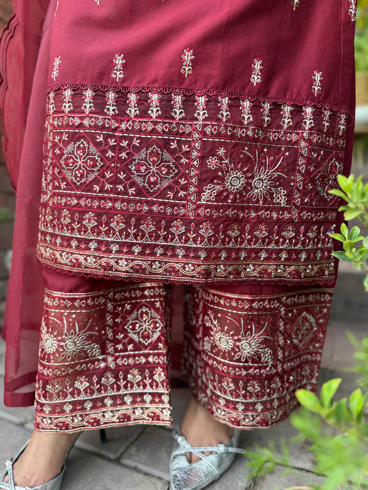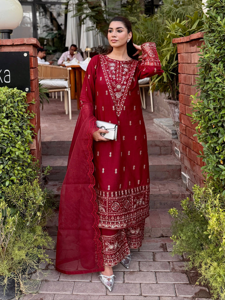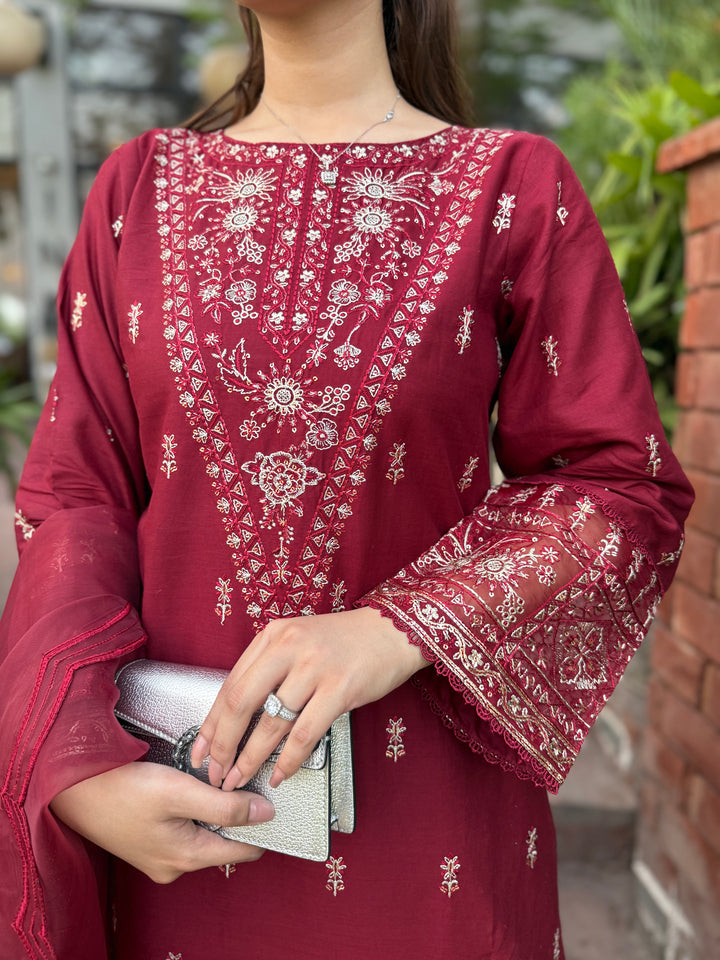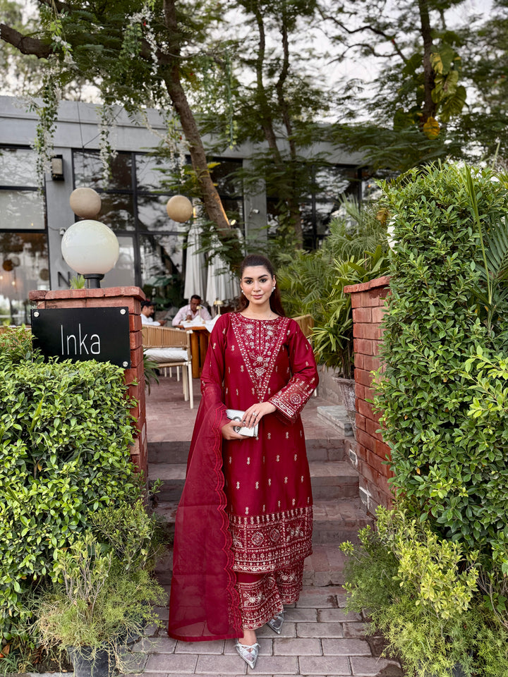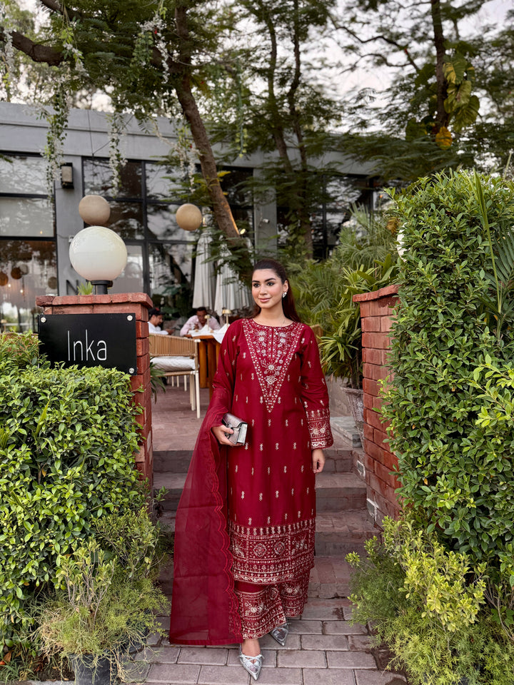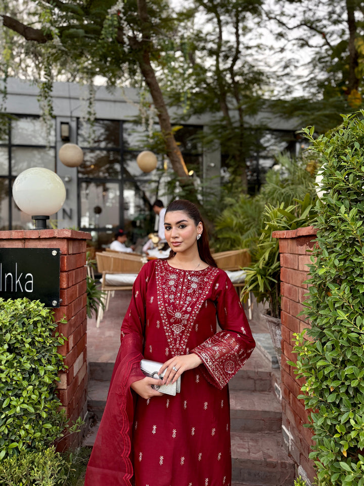 This 3-piece stitched lawn dress is a perfect blend of elegance and style, ideal for festive and party wear. The outfit features beautifully embroidered detailing that adds a touch of sophistication. Paired with a lightweight and graceful organza dupatta, this ensemble is designed to make you stand out on any special occasion.