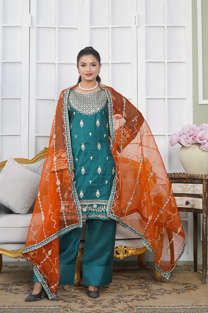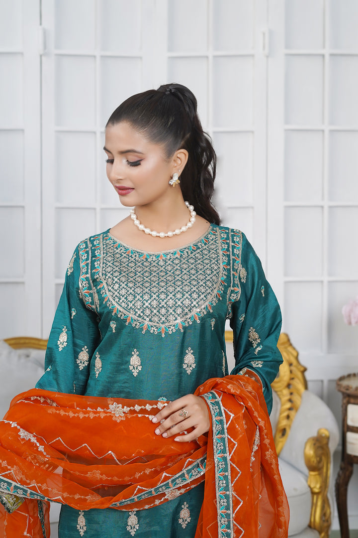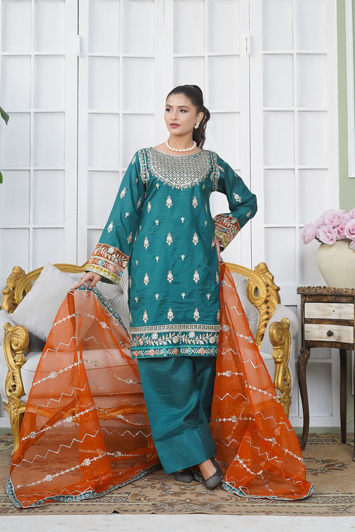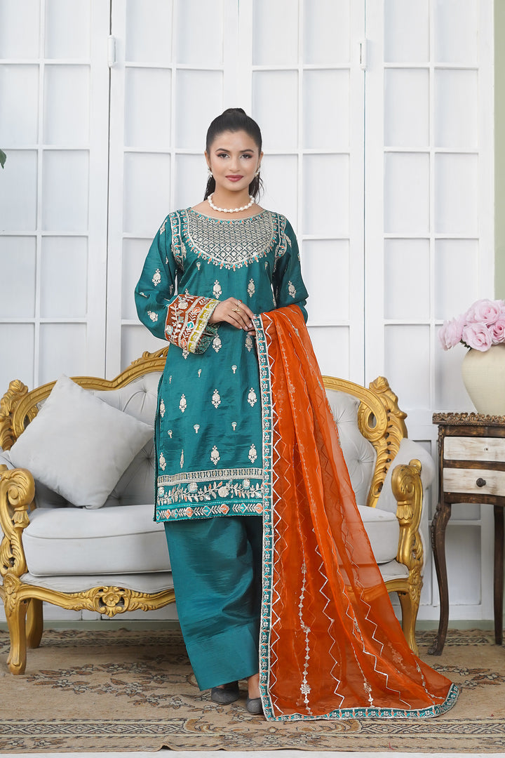 Radiate charm and elegance with this beautifully crafted 3-piece ensemble, perfect for refined day or evening wear. The dobby shirt features a delicately embroidered neckline, a dyed front with spray embroidery, and organza embroidered borders that add a graceful touch. Intricately designed sleeves with spray embroidery and organza borders, along with an embroidered armhole and dyed back, complete the look. The regular-fit pink cambric farshi shalwar offers comfort with its elasticated waistband. Paired with a vibrant orange poly organza dupatta, adorned with sequins, tilla, and thread embroidery along all four sides, this outfit blends tradition and sophistication effortlessly.