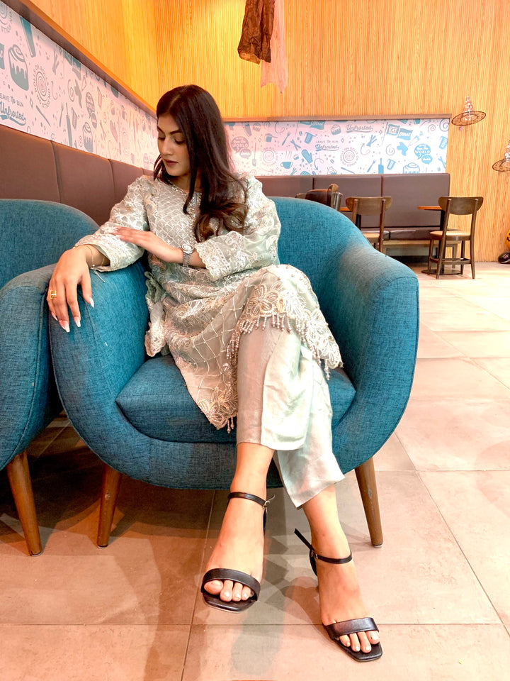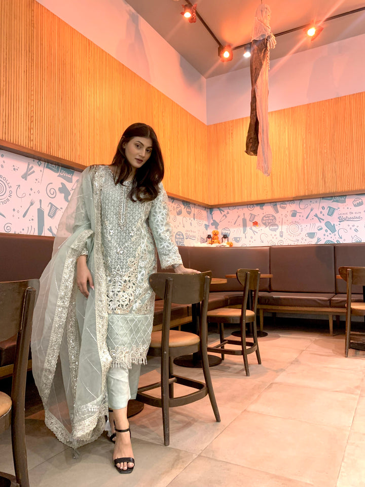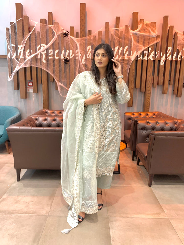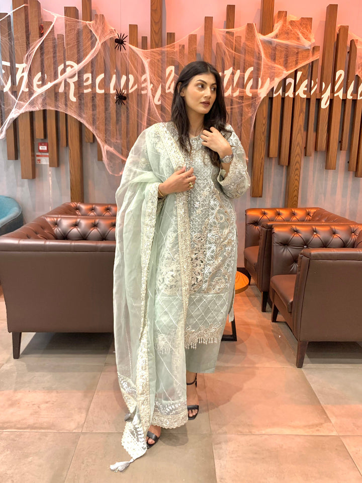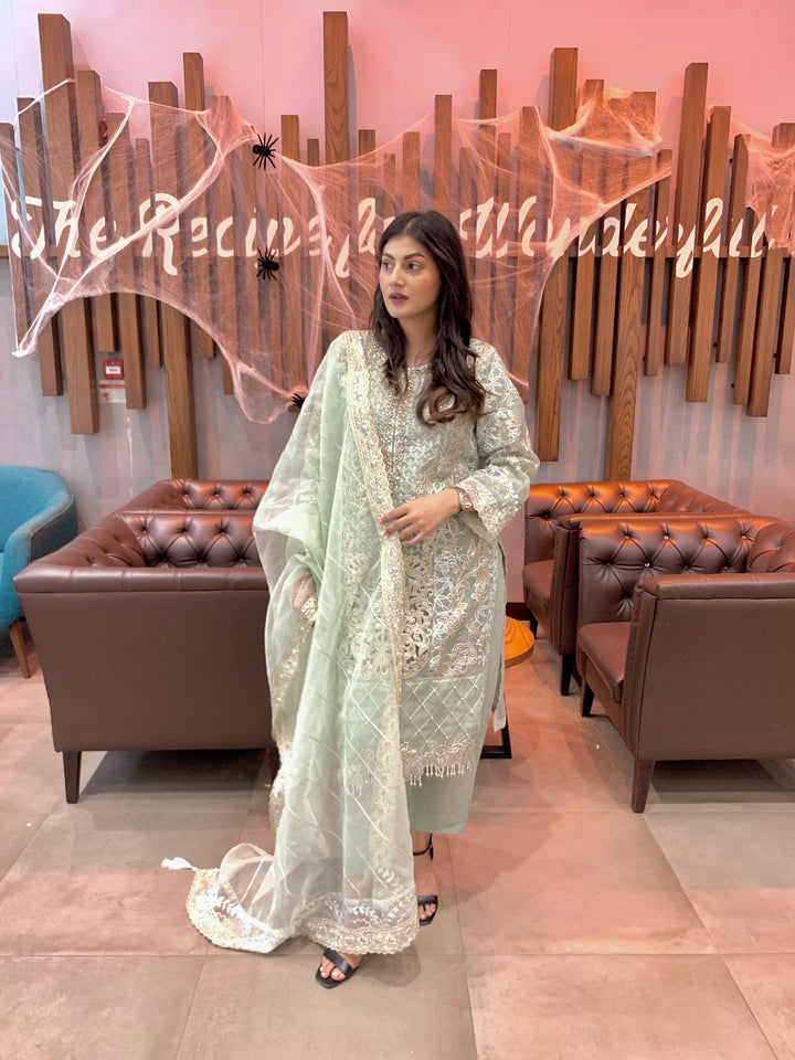 This exquisite 3-piece stitched dress is perfect for all seasons, combining elegance with timeless craftsmanship. The shirt and dupatta are made from premium chiffon, offering a light and graceful drape, while the trouser is tailored from luxurious chiffon for a refined finish. Adorned with intricate embroidery work this ensemble is ideal for festive gatherings and special occasions.