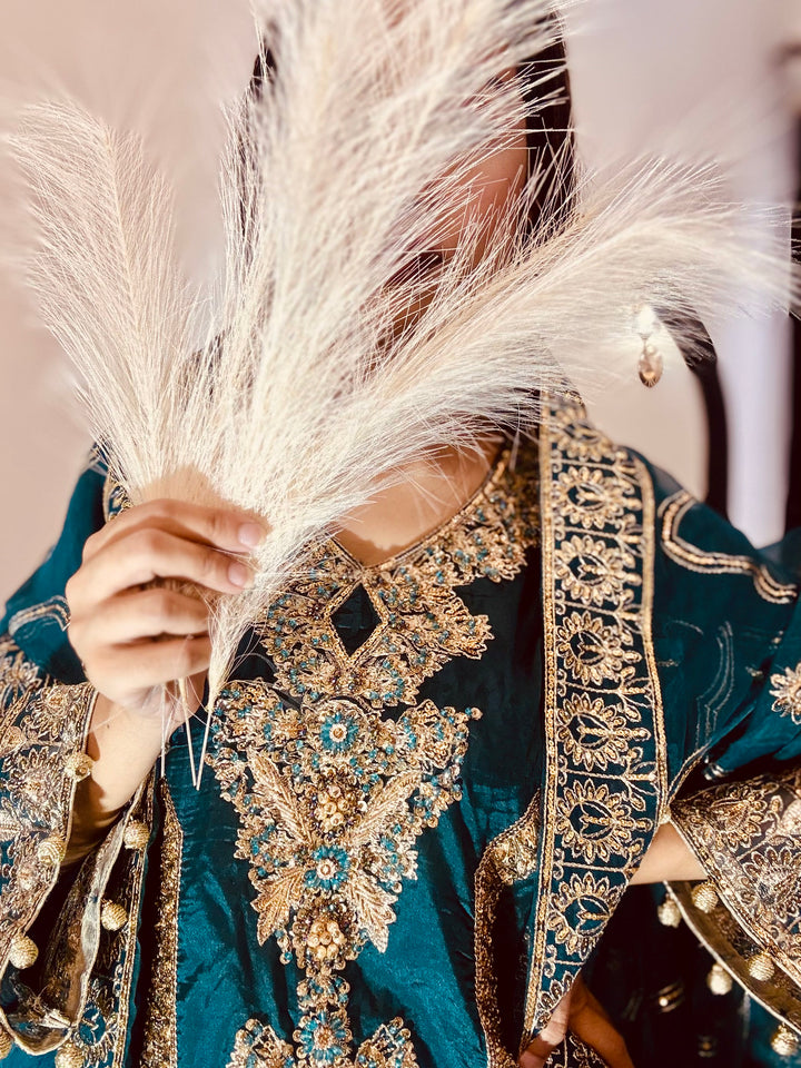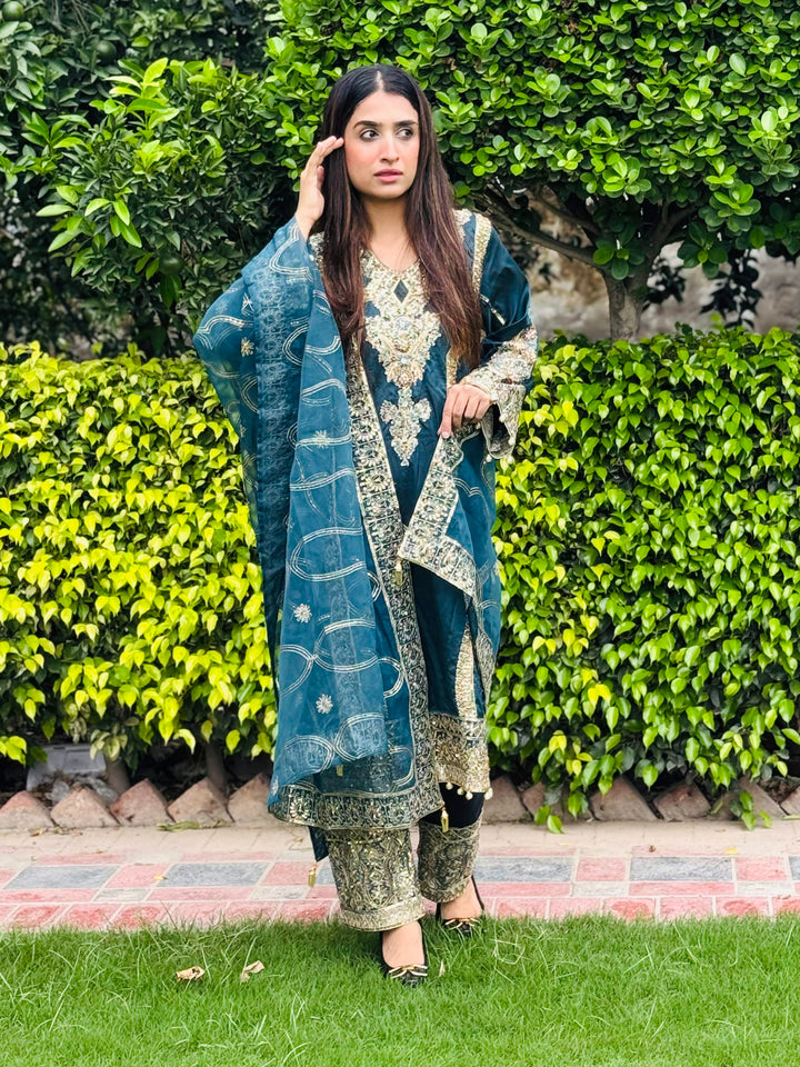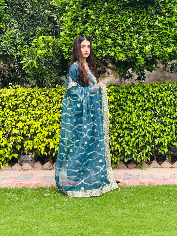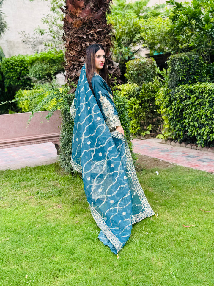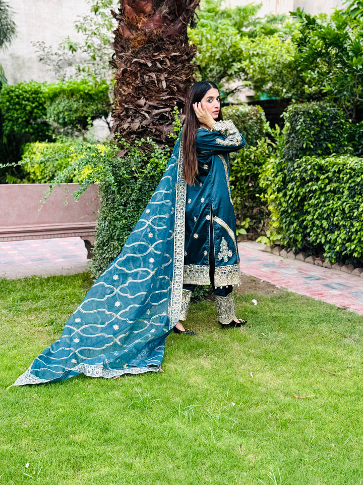 This luxurious 3-piece ladies' ensemble is crafted for timeless elegance. The shirt, made from rich Tussar silk, features intricate Naqshi and Dhabba handwork, showcasing exceptional craftsmanship. Paired with a matching Tussar silk trouser, the outfit offers a cohesive and refined look. The ensemble is completed with a delicate organza dupatta, adding a graceful and airy touch — perfect for formal gatherings or festive occasions.