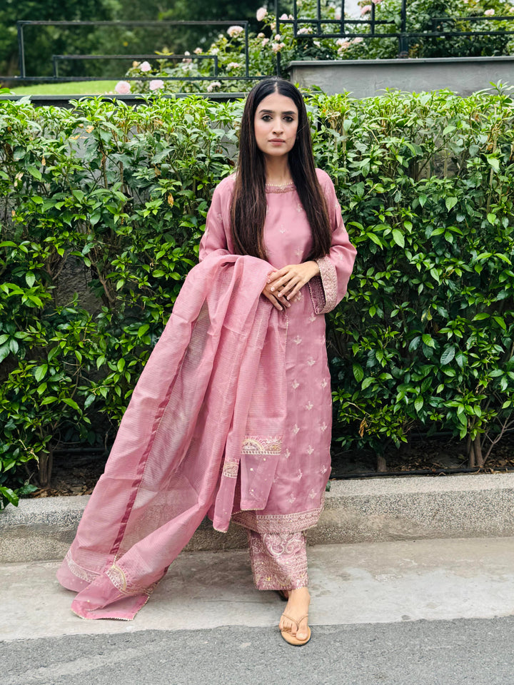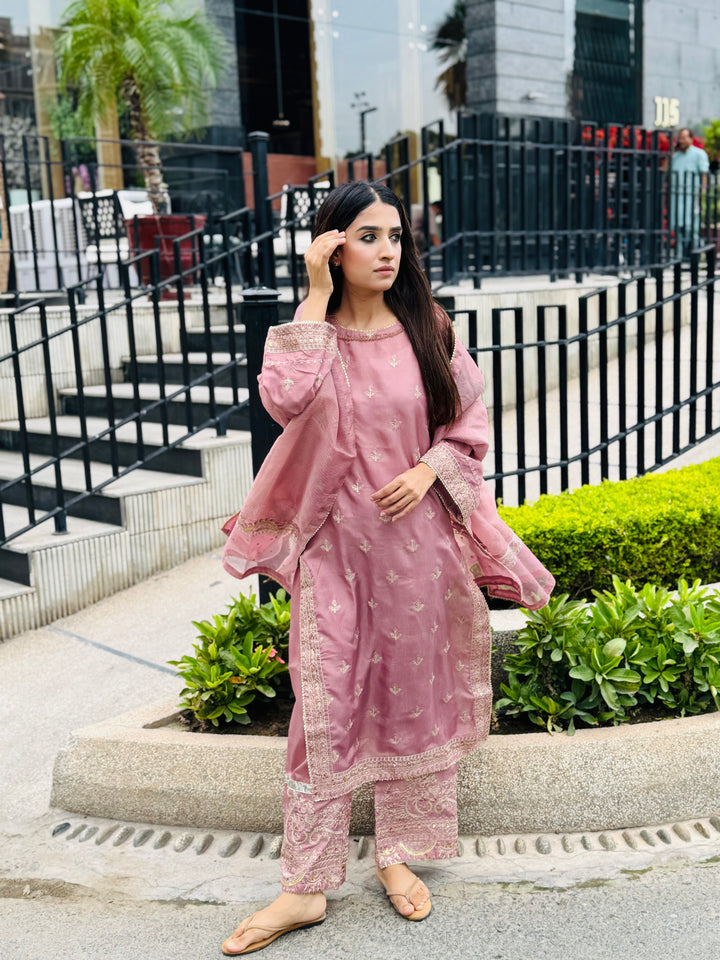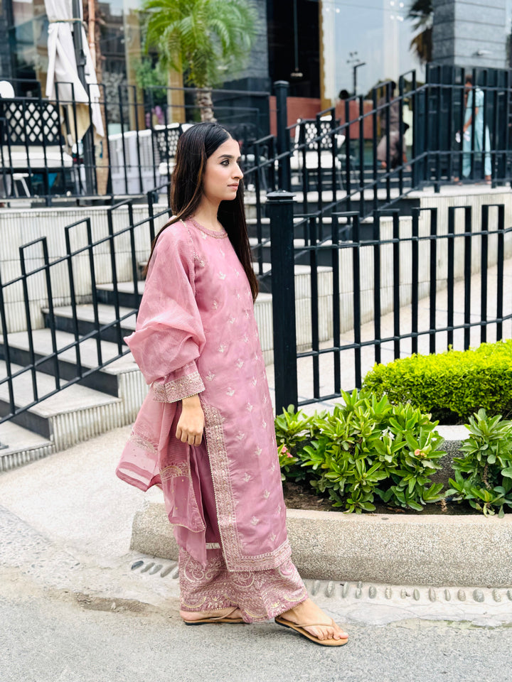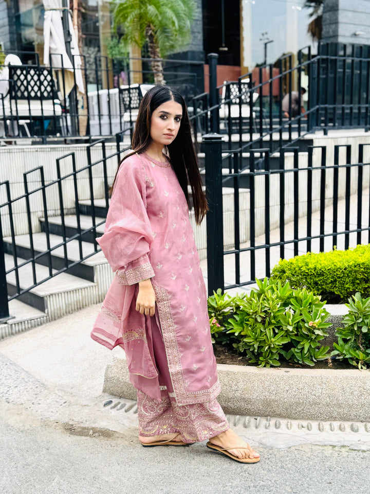 This stitched 3-piece dress is a timeless choice for festive and party wear, suitable for all seasons. The shirt, crafted from luxurious Tussar silk, is beautifully embroidered, paired with a matching Tussar silk palazzo trouser for a modern yet elegant look. The organza dupatta, also adorned with delicate embroidery, adds a graceful finishing touch, making this ensemble perfect for special occasions.