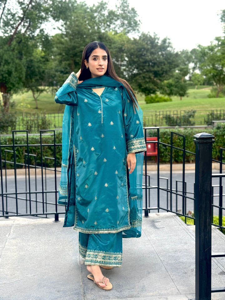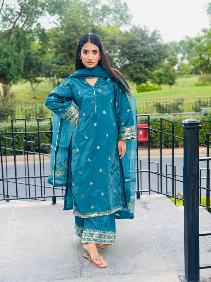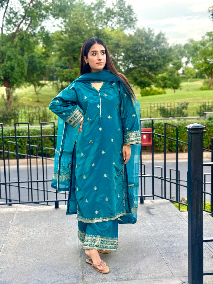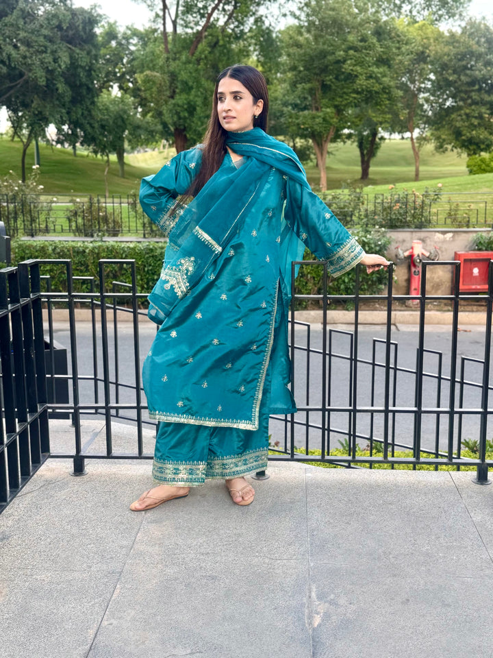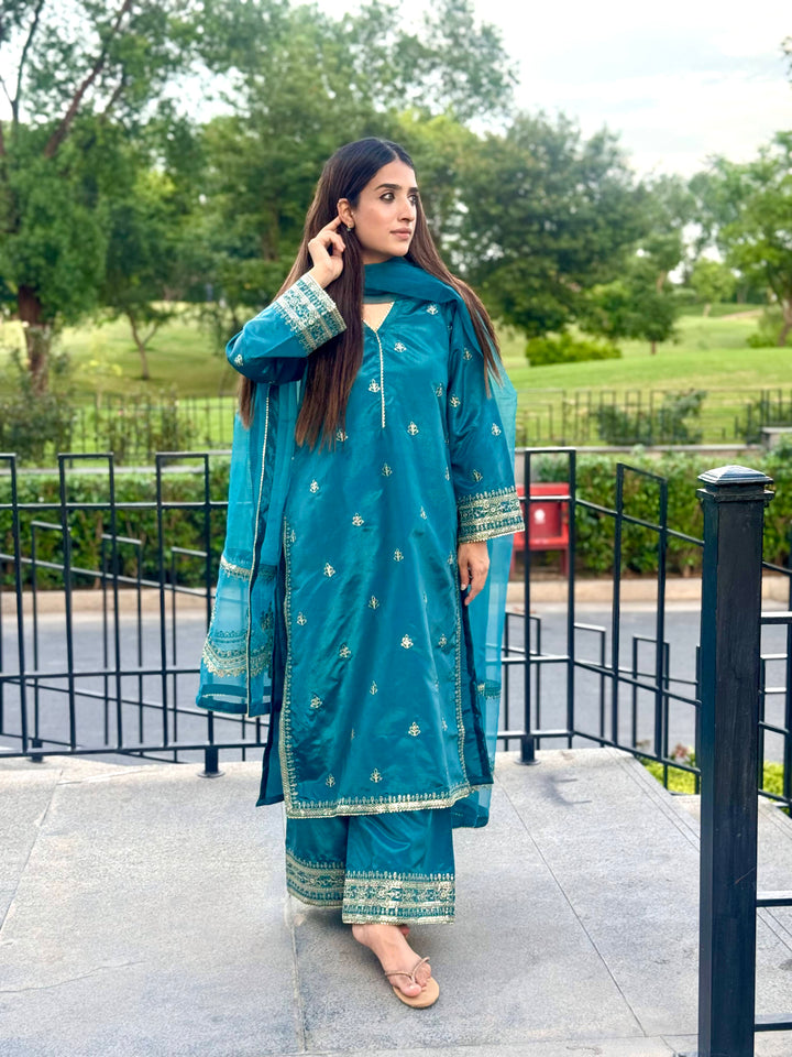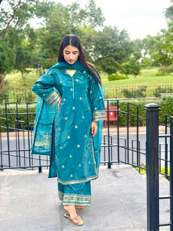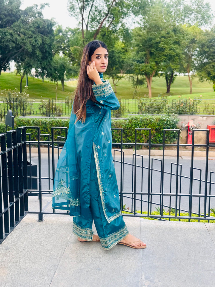 This luxurious 3-piece ladies' ensemble is crafted for timeless elegance. The shirt, made from rich Tussar silk, features intricate Naqshi and Dhabba handwork, showcasing exceptional craftsmanship. Paired with a matching Tussar silk trouser, the outfit offers a cohesive and refined look. The ensemble is completed with a delicate organza dupatta, adding a graceful and airy touch — perfect for formal gatherings or festive occasions.