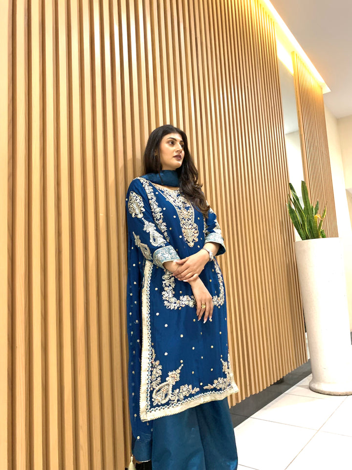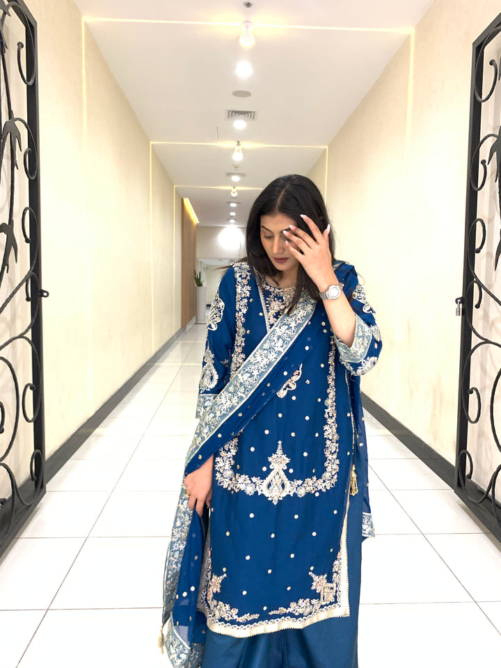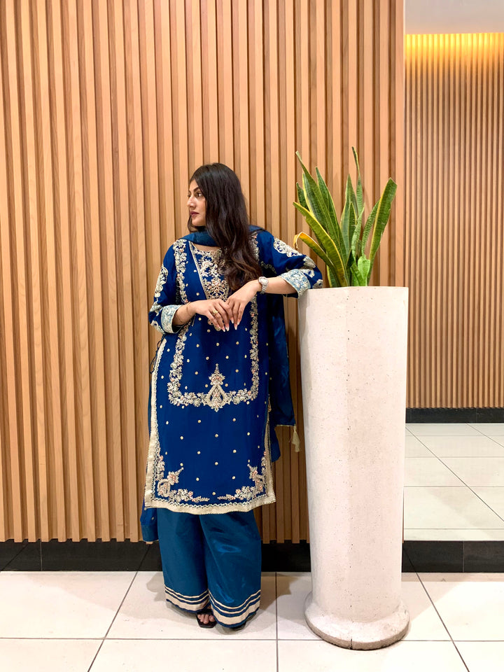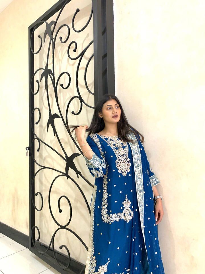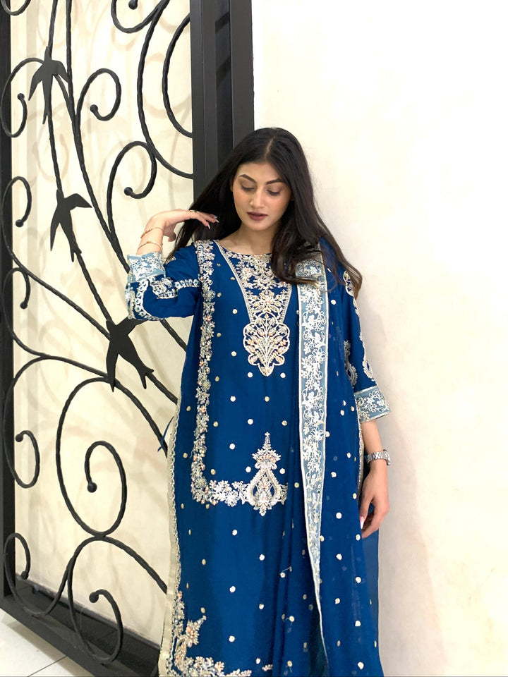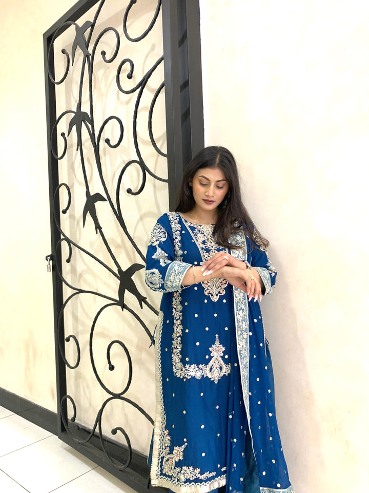 This exquisite 3-piece stitched dress is perfect for all seasons, combining elegance with timeless craftsmanship. The shirt and dupatta are made from premium chiffon, offering a light and graceful drape, while the trouser is tailored from luxurious chiffon for a refined finish. Adorned with intricate embroidery & handmade work this ensemble is ideal for festive gatherings and special occasions.