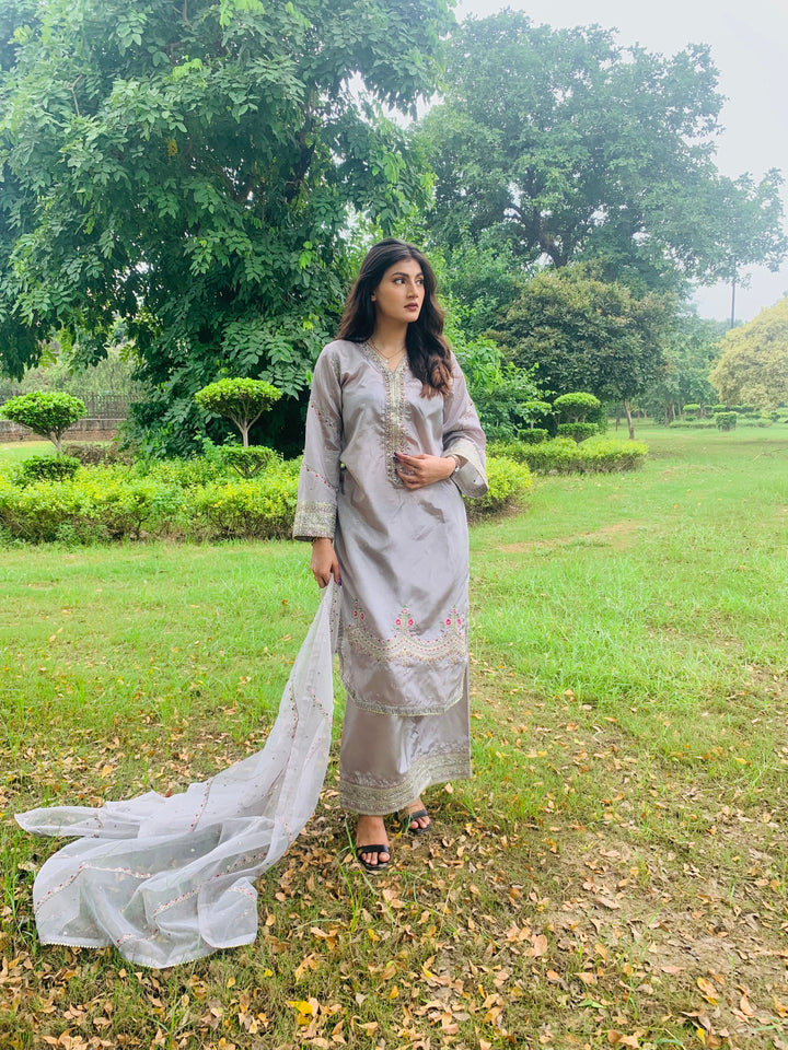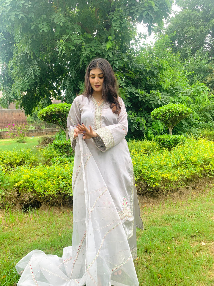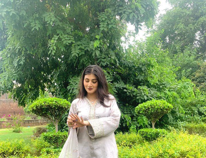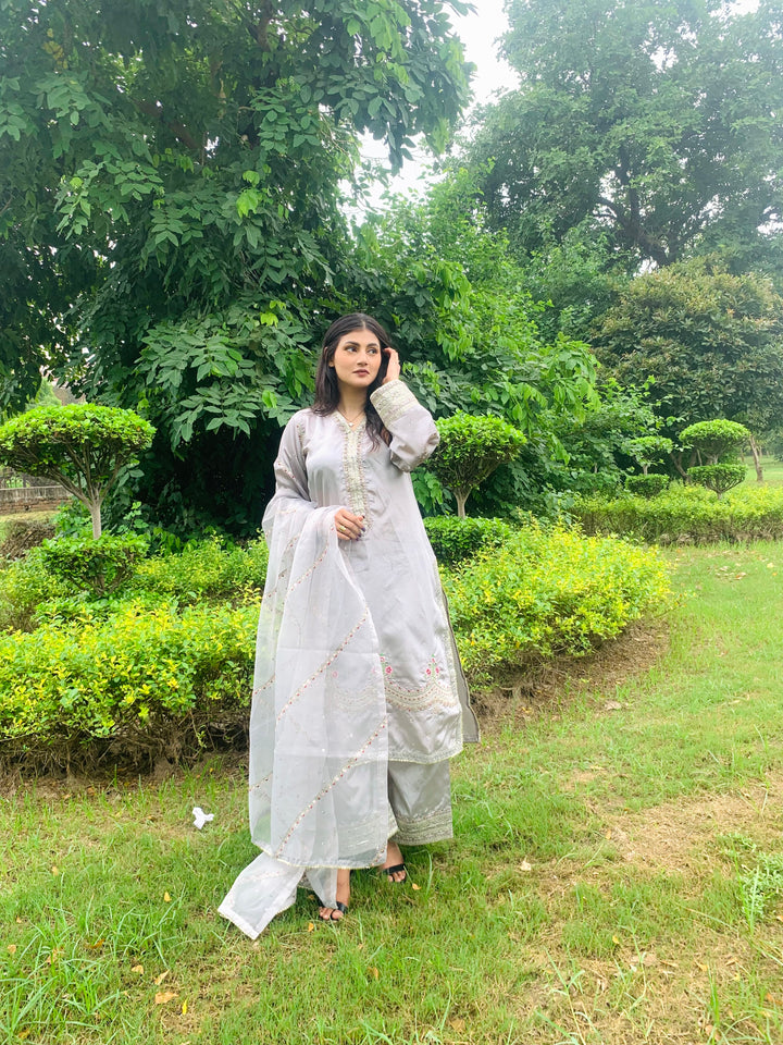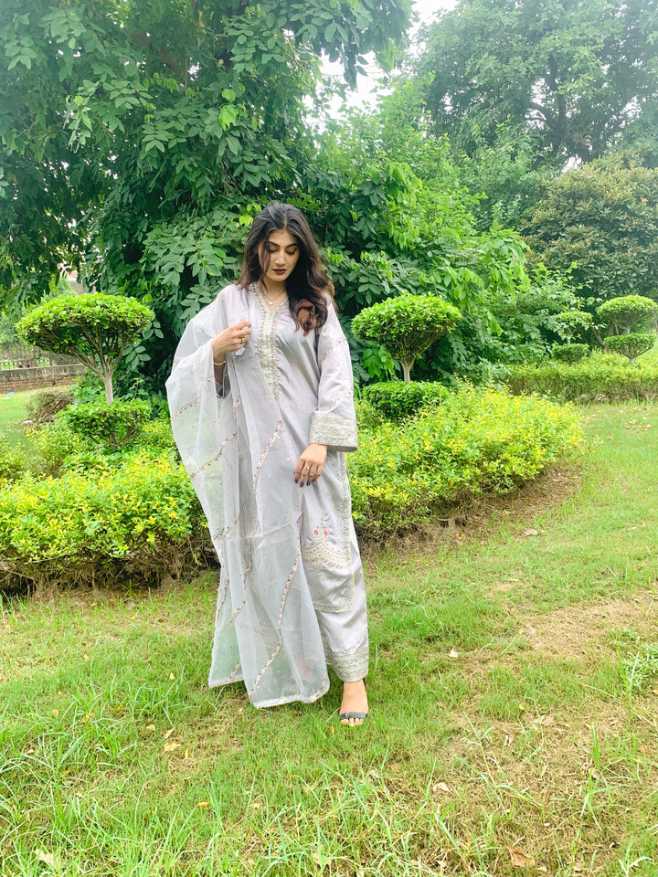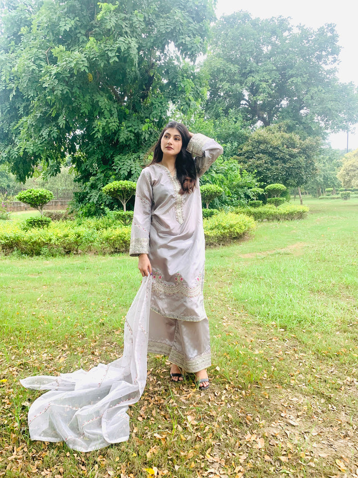 This luxurious 3-piece ladies’ ensemble is crafted for timeless elegance. The shirt, made from rich Tussar silk, features intricate Naqshi and Dhabcha handwork, showcasing exceptional craftsmanship. Paired with a matching Tussar silk trouser, the outfit offers a cohesive and refined look. The ensemble is completed with a delicate organza dupatta, adding a graceful and airy touch — perfect for formal gatherings or festive occasions.