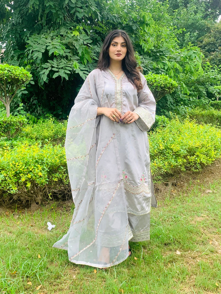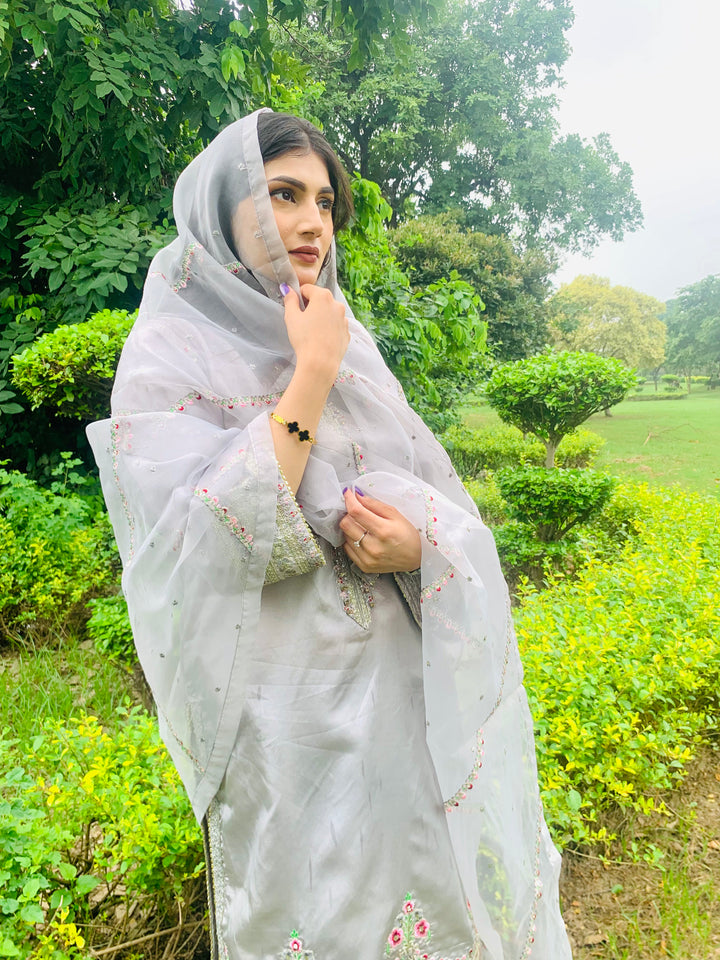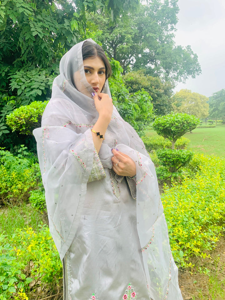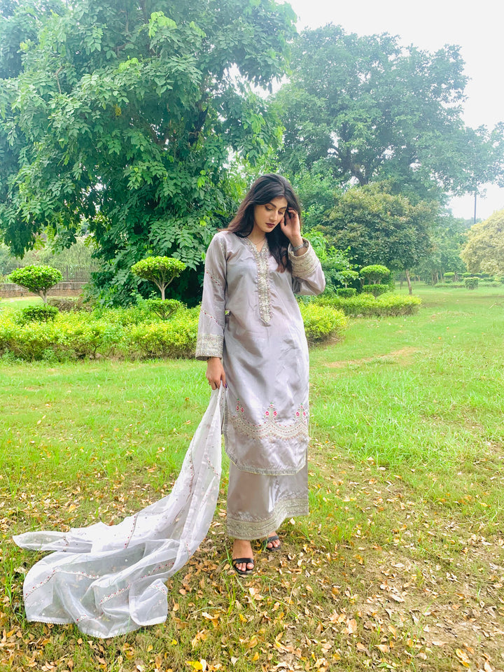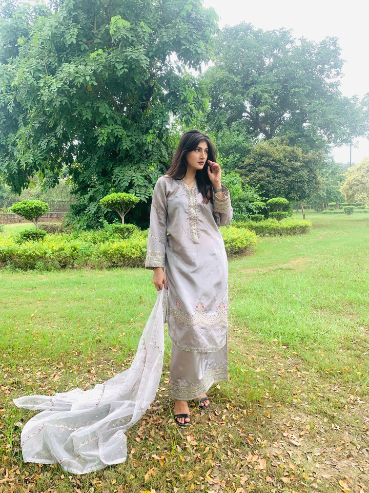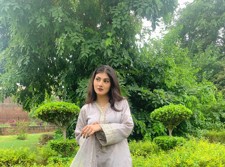 This luxurious 3-piece ladies’ ensemble is crafted for timeless elegance. The shirt, made from rich Tussar silk, features intricate Naqshi and Dhabcha handwork, showcasing exceptional craftsmanship. Paired with a matching Tussar silk trouser, the outfit offers a cohesive and refined look. The ensemble is completed with a delicate organza dupatta, adding a graceful and airy touch — perfect for formal gatherings or festive occasions.
